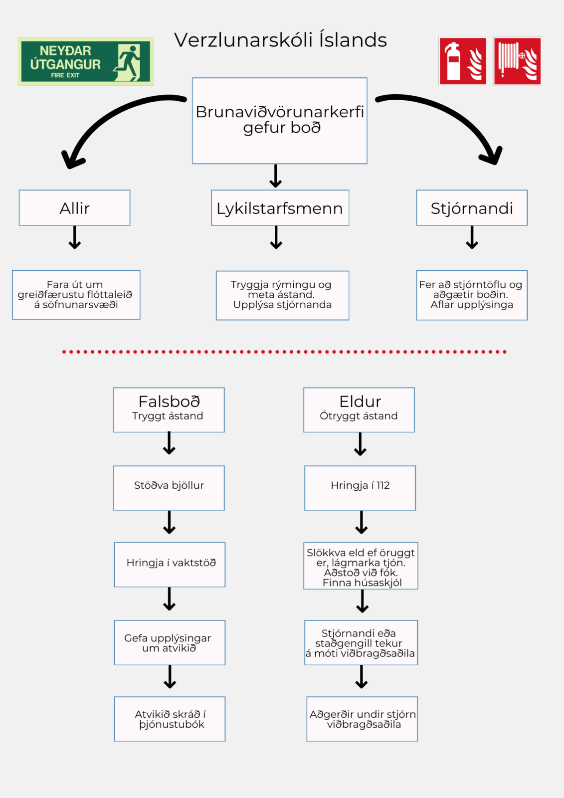 Ef brunaviðvörunarkerfi gefur boð (vælur fara í gang), skal kennari rýma stofuna samstundis og fara greiðfærustu flóttaleið út úr skólanum og fylgja nemendum sínum á söfnunarstað. Ef reykur er á ganginum skal haldið kyrru fyrir í stofunni og bíða eftir björgun út um neyðarop (glugga). Kennari tryggir að allir: