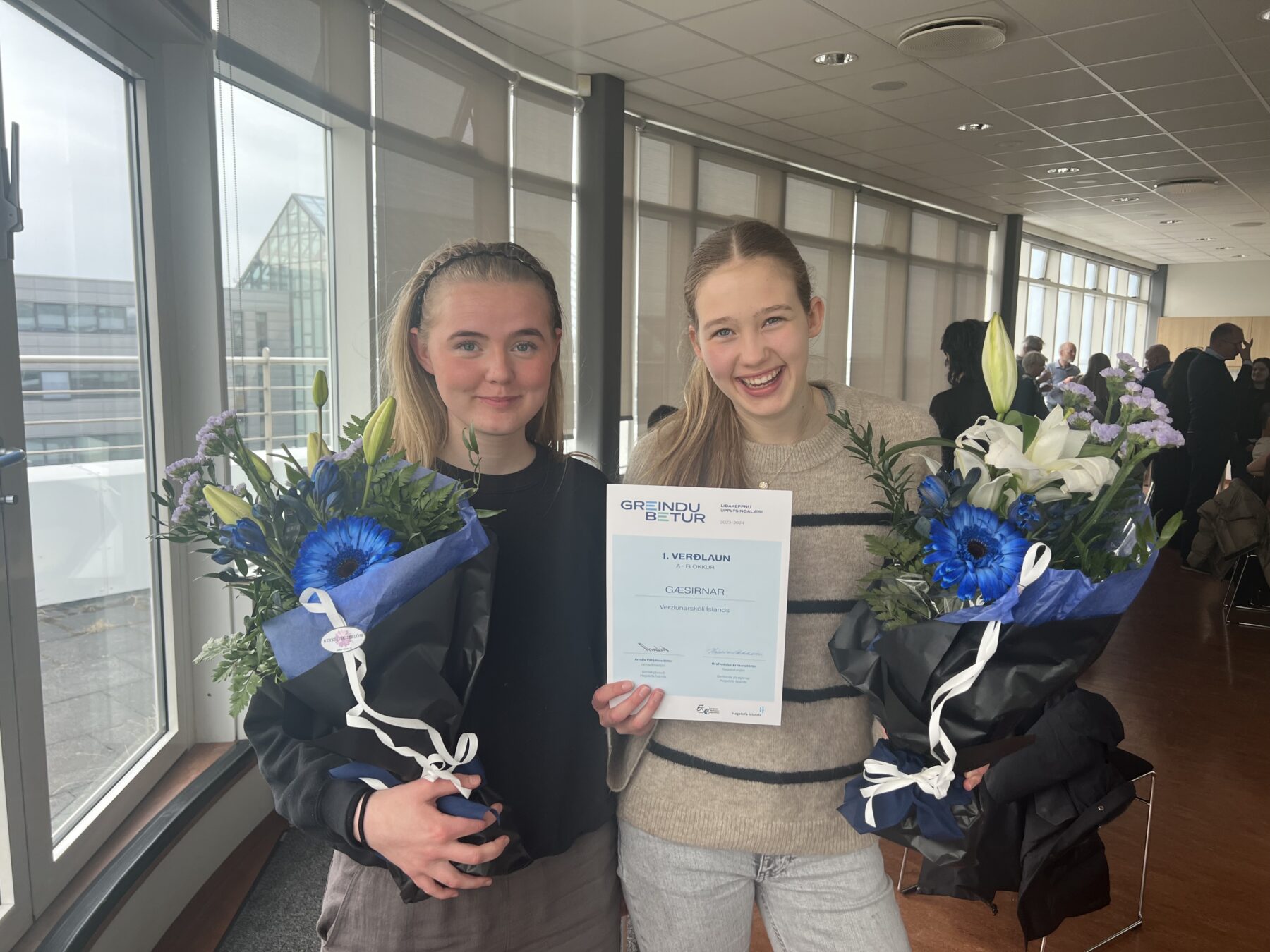 04.04.2024 1. sæti í keppninni Greindu betur Þær Una Helgadóttir og Karolína Björk Líndal Ingadóttir, nemendur á 1. ári í Verzlunarskólunum hlutu verðlaun fyrir 1. sæti í keppninni Greindu betur. Liðstjóri var Anna Hera Björnsdóttir, stærðfræðikennari við skólann. Um er að ræða liðakeppni í tölu- og upplýsingalæsi sem er á vegum Hagstofu Íslands og var haldin í 3ja sinn nú nýverið. Keppnin er tvískipt, í fyrri hluta hennar er spurningum svarað um þekkingu á tölfræði og upplýsingum frá Hagstofu Íslands og Evrópsku hagstofunni (Eurostat). Í seinni hlutanum er unnið að sjálfstæðu verkefni sem byggir á gögnum frá Hagstofu Íslands. Una og Karolína gerðu verkefni þar sem þær greindu gögn um ferðamenn sem ferðast í gegnum Keflavíkurflugvöll. Þær fundu ýmislegt áhugavert um efnið á vef Hagstofunnar, unnu tölfræðiúrvinnslur og settu saman í skýrslu. Við óskum þeim innilega til hamingju með sigurinn.