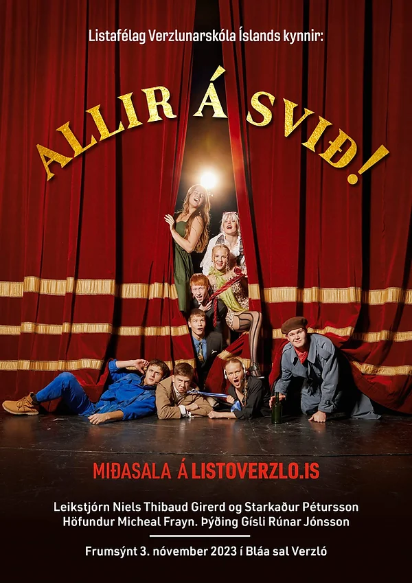 08.11.2023 Allir á svið Listafélag Verzlunarskóla Íslands setur upp leiksýningu í hátíðarsal skólans á hverju ári. Mikill metnaður er lagður í uppsetninguna og ekki síður í leikmyndina en nemendur sjá alfarið um hana sjálfir. Verkið sem varð fyrir valinu að þessu sinni ber nafnið Allir á svið! í þýðingu Gísla Rúnars Jónssonar. Leikstjórar verksins eru Níels Thibaud Girerd og Starkaður Pétursson. Verkið fjallar um leikhóp sem er að setja upp leiksýninguna Nakin á svið. Fyrir hlé fá áhorfendur að skyggnast baksviðs á meðan leiksýningunni stendur og upplifa ýmsar skrautlegar uppákomur hjá leikurunum. Eftir hlé fá áhorfendur annað sjónarhorn og horfa á sýninguna Nakin á svið og vita þá upp á hár hvað er í gangi baksviðs á sama tíma. Bráðskemmtilegur farsi þar sem allt fer úrskeiðis, ástarflækjur og misskilningur. Verk sem kitlar svo sannarlega hláturtaugar áhorfenda. Við hvetjum ykkur til að sjá þetta flotta verk. Hægt er að kaupa miða hér: Kaupa miða