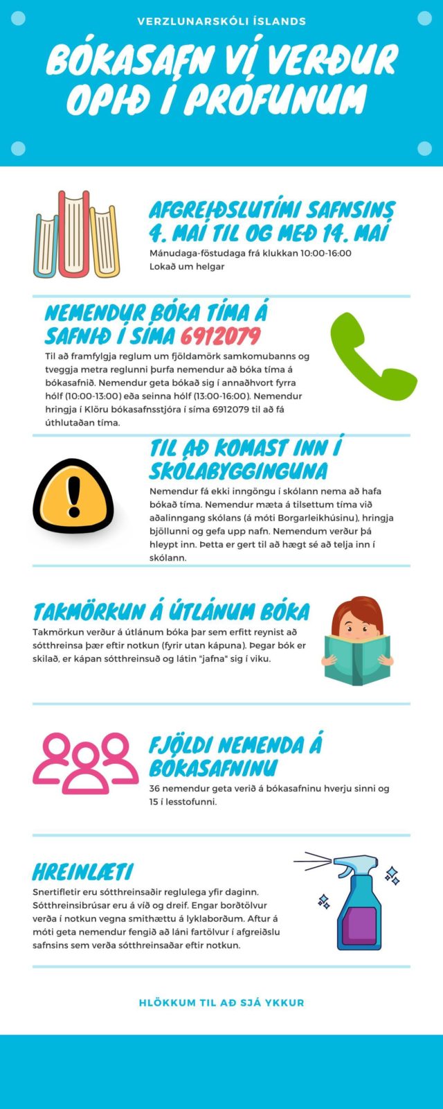27.04.2020 Bókasafn VÍ opið í prófunum Bókasafn VÍ verður opið í prófunum. Til að framfylgja reglum um fjöldamörk samkomubanns og tveggja metra reglunni þurfa nemendur að bóka tíma á bókasafnið. Nemendur geta bókað sig í annaðhvort fyrra hólf (10:00-13:00) eða seinna hólf (13:00-16:00). Nemendur hringja í Klöru bókasafnsstjóra í síma 6912079 til að fá úthlutaðan tíma. Sjá nánari upplýsingar hér. BÓKASAFN VÍ
