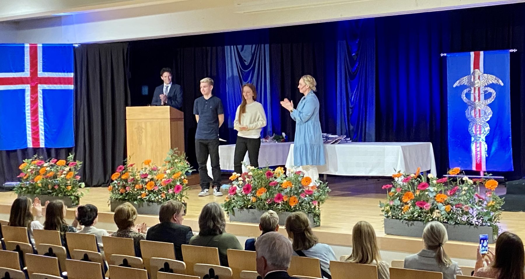 29.05.2022 Brautskráning 2022 Brautskráning stúdenta frá Verzlunarskólanum fór fram laugardaginn 28. maí við hátíðlega athöfn í hátíðarsal skólans. Skólinn var settur í hátíðarbúning þar sem útskriftarnemendur skreyttu heimastofur sínar og myndir af útskriftarnemendum voru settar á veggi skólans. Að þessu sinni brautskráðust 333 nýstúdentar frá Verzlunarskólanum. Eftir að útskriftarefnin höfðu tekið við prófskírteinum sínum fóru þau og forráðamenn þeirra í íþróttahús skólans og áttu notalega samverustund saman til að fagna áfanganum. Guðrún Inga Sívertsen, skólastjóri, flutti nemendum kveðjuorð sín þar sem hún lagði áherslu á hversu vel nemendur og kennarar hefðu staðið sig síðustu þrjú árin þegar veiran skæða kom í veg fyrir að skólaganga þeirra yrði hefðbundin. Kennarar þurftu að tileinka sér rafrænar lausnir til náms og kennslu og nemendur snéru þá bökum saman og hjálpuðu hvort öðru t.d. með streymi til þeirra sem ekki komust í skólann vegna sóttkvíar eða einangrunar. Við mjög erfiðar aðstæður náðu starfsmenn skólans að gera hluti sem aðrir litu til. Sama má segja um félagslífið, en þegar það var lítið sem ekkert lögðu nemendur höfuðið í bleyti, hugsuðu í lausnum og létu ekkert stoppa sig. Guðrún Inga hvatti nemendur til að halda áfram á sömu braut þar sem þrautseigja og elja myndi koma þeim langt. Að vanda var úthlutað úr VÍ 100 sjóðnum en hann var stofnaður í tilefni af 100 ára afmælis skólans. Fyrrverandi nemendur skólans lögðu fé í sjóðinn og í skipulagsskrá fyrir sjóðinn segir m.a. að árlega skuli hann styrkja valda nemendur með fjárframlagi, þegar þeir flytjast milli bekkja eða ljúka stúdentsprófi. Skal við það miðað að styrkþegar hafi sýnt afburða námsárangur eða lagt verulega af mörkum til skólastarfsins á annan hátt. Dúx skólans var Helgi Hrannar Briem í 3-I. Hlaut hann bókagjafir og námsstyrk. Semidúxinn var Ómar Ingi Halldórsson 3-H og hlaut hann bókagjöf og námsstyrk. Nemendur með 9,5 og hærra fengu einnig bókagjafir og námsstyrk og voru það eftirfarandi nemendur: Nafn Bekkur Birgitta Ósk Úlfarsdóttir 3-X Fríða Margrét Almarsdóttir 3-Y Kristína Katrín Þórsdóttir 3-F Sæmundur Árnason 3-X Klara Margrét Ívarsdóttir 3-R Dagur Þórisson 3-B Dagur Brabin Hrannarsson 3-Y Margrét Rán Rúnarsdóttir 3-U Jafnframt voru veitt verðlaun fyrir bestan námsárangur að loknu 1. og 2. ári og voru það eftirfarandi nemendur: Nafn Bekkur Ragna María Sverrisdóttir 1-X Alexander K. Bendtsen 2-Y Skólinn óskar öllum brautskráðum nemendum skólans innilega til hamingju með áfangann og velfarnaðar í framtíðinni.