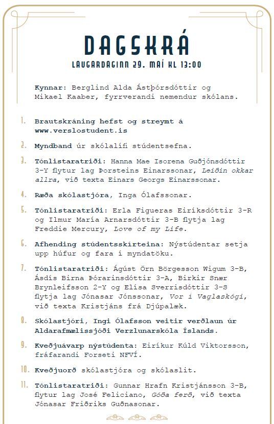 28.05.2021 Brautskráning í beinni útsendingu Vegna fjöldatakmarkana verður brautskráning stúdentsefna Verzlunarskóla Íslands 2021 í beinni útsendingu á www.verslostudent.is . Stúdentsefnin mæta í hús klukkan 12:45 og safnast saman í heimastofum bekkja. Þrátt fyrir fjöldatakmarkanir bjóðum við foreldra velkomna í hús þegar komið er að brautskráningu bekkjar þeirra barns. Foreldrar ganga inn frá bílastæði nemenda við Ofanleiti. Starfsmenn skólans verða við inngang til að vísa foreldrum rétta leið. Á meðfylgjandi mynd (smella á myndina til að stækka hana)má sjá dagskrá brautskráningarinnar.