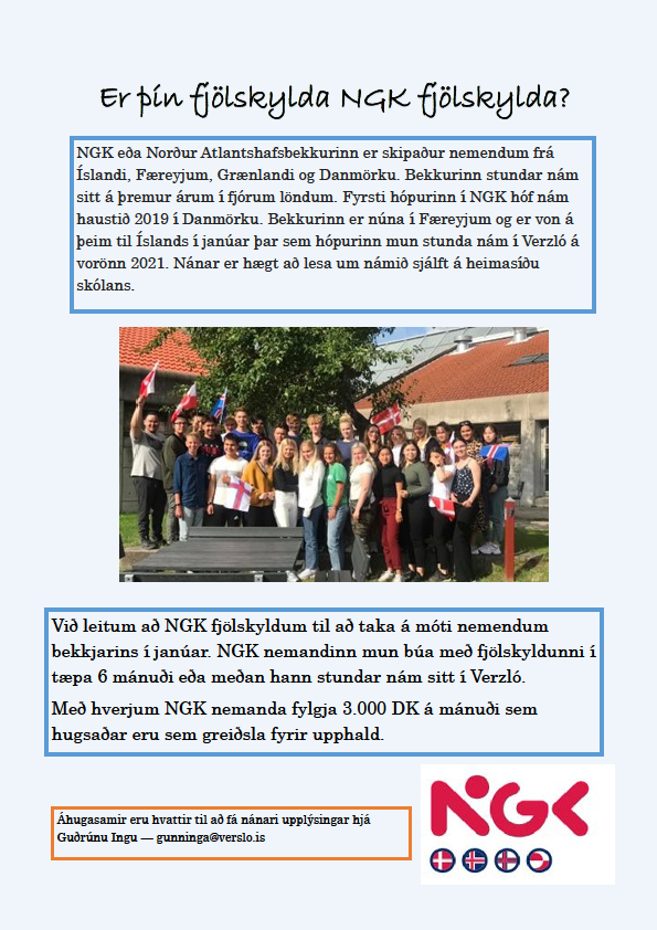 06.11.2020 Er þín fjölskylda NGK fjölskylda? Norður-Atlantshafsbekkurinn (Nord-Atlantisk gymnasiumklasse), NGK, er nýjung fyrir ungmenni á Íslandi, Færeyjum, Grænlandi og í Danmörku, sem hafa áhuga á að mennta sig á Norður-Atlantshafssvæðinu. Nemendur mynda bekk sem á þremur árum fær bæði faglegt og menningarlegt framlag frá fjórum löndum. Að auki fá þeir aðgang að einstakri námsbraut sem inniheldur meðal annars líftækni, stærðfræði og norðurskautstækni. Kynntu þér NGK frekar og skoðaðu bæklinginn. Bekkurinn stundar nám sitt á þremur árum í fjórum löndum. Fyrsti hópurinn í NGK hóf nám haustið 2019 í Danmörku. Bekkurinn er núna í Færeyjum og er von á þeim til Íslands í janúar þar sem hópurinn mun stunda nám í Verzló á vorönn 2021. Við leitum að NGK fjölskyldum til að taka á móti nemendum bekkjarins í janúar. NGK nemandinn mun búa með fjölskyldunni í tæpa 6 mánuði eða meðan hann stundar nám sitt í Verzló. Með hverjum NGK nemanda fylgja 3.000 DK á mánuði sem hugsaðar eru sem greiðsla fyrir uppihald. Áhugasamir eru hvattir til að fá nánari upplýsingar hjá Guðrúnu Ingu – gunninga@verslo.is