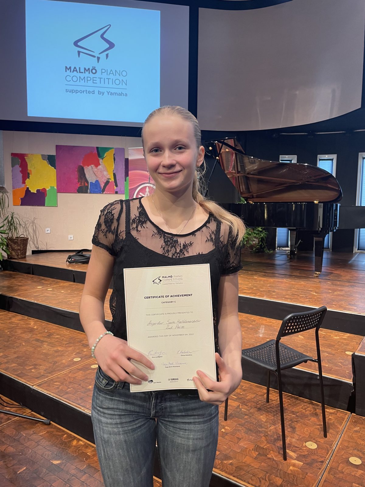 24.11.2022 Frábær árangur Ásgerðar Söru í alþjóðlegri píanókeppni Ásgerður Sara Hálfdanardóttir, nemandi á 1. ári við skólann tók þátt í alþjóðlegri píanókeppni í Malmö í byrjun nóvember. Hún náði frábærum árangri og vann til tveggja verðlauna í sínum aldursflokki. Dómnefndin var sammála því að píanóleikur hennar einkenndist af mikilli útgeislun og djúpri tilfinningu fyrir tónlistinni. Skólinn óskar Ásgerði Söru til hamingju með þennan frábæra árangur.
