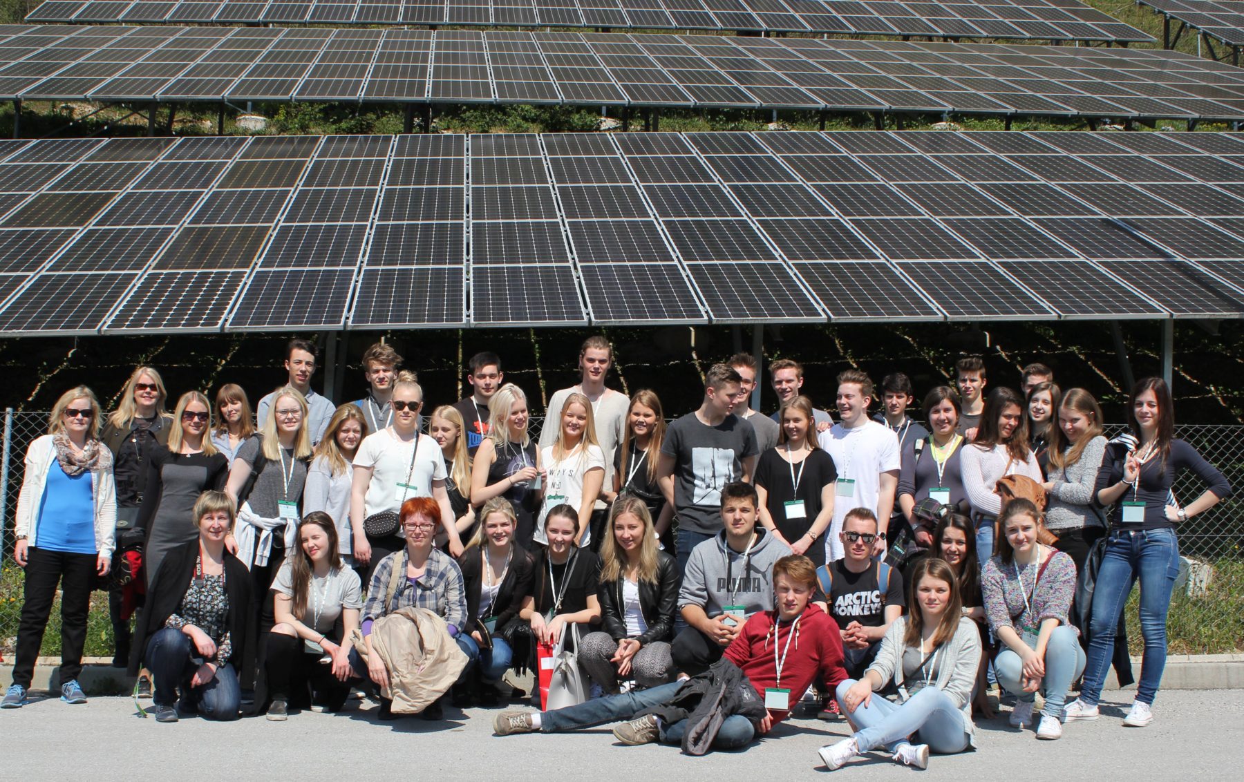 15.04.2015 Nemendaheimsókn til Tolmin í Slóveníu 16 nemendur Verzlunarskólans ásamt tveimur kennurum eru nýkomnir heim eftir vikudvöl í Tolmin í Slóveníu í tengslum við nemendaskiptaverkefni milli Verzlunarskólans og Gimnazija Tolmin. Viðfangsefni verkefnisins er Think Global, Act Local – The Importance of Green Energy, Sustainability and Innovation. Það er skemmst frá því að segja að Verzlóhópurinn var ákaflega ánægður með dvölina og móttökur þar ytra. Nemendur kynntu verkefni sem þeir hafa verið að vinna að, skoðuðu hina undurfögru náttúru héraðsins, fóru í vettfangsferðir í vatnsaflsvirkjun og í fyrirtæki sem framleiðir rafmagn með sólarsellum. Slóvensku nemendurnir koma svo til Íslands í lok september næstkomandi. Á myndinni má sjá nemendur og kennara frá Verzló og Gimnazija Tolmin fyrir framan sólarsellur