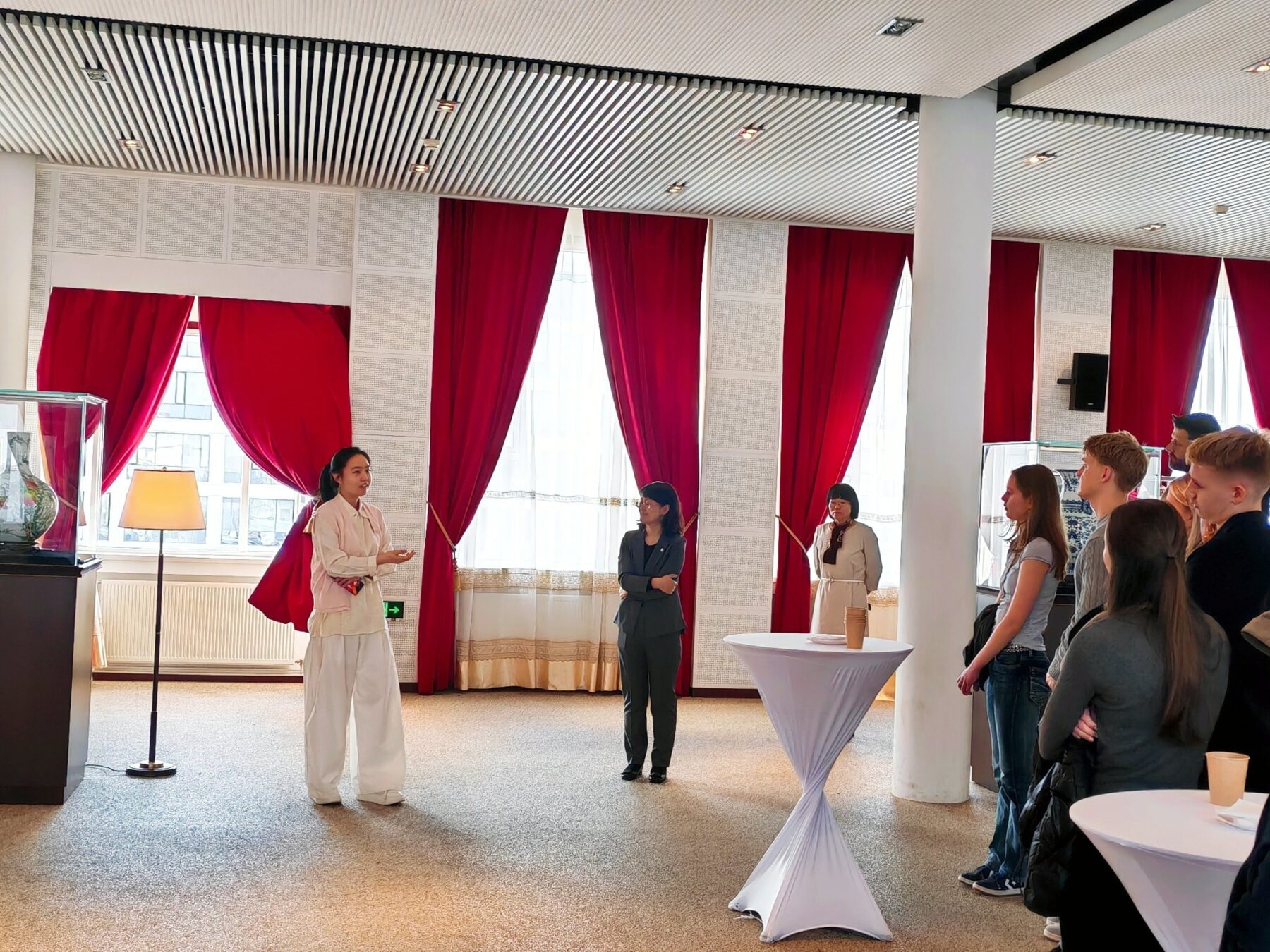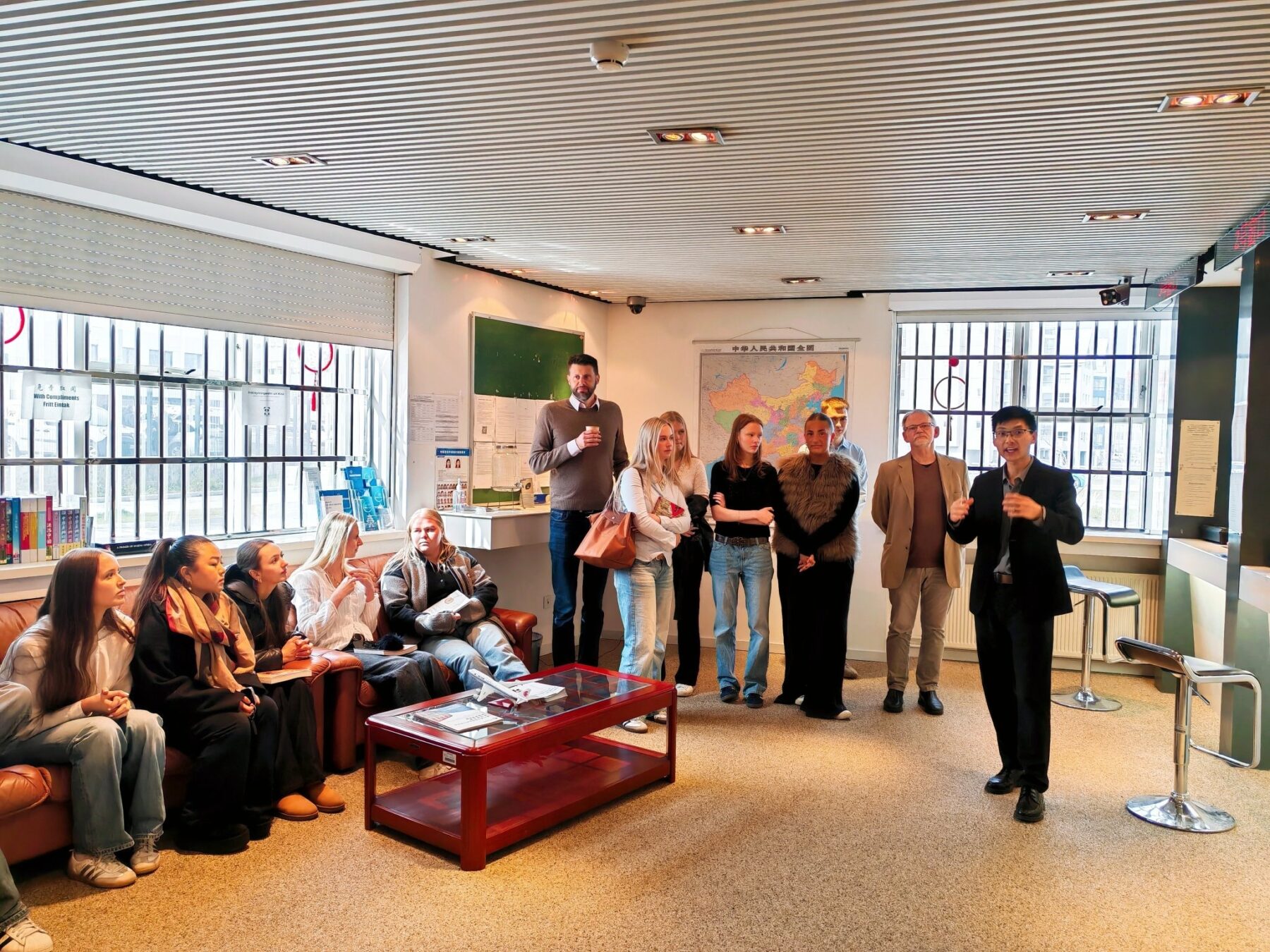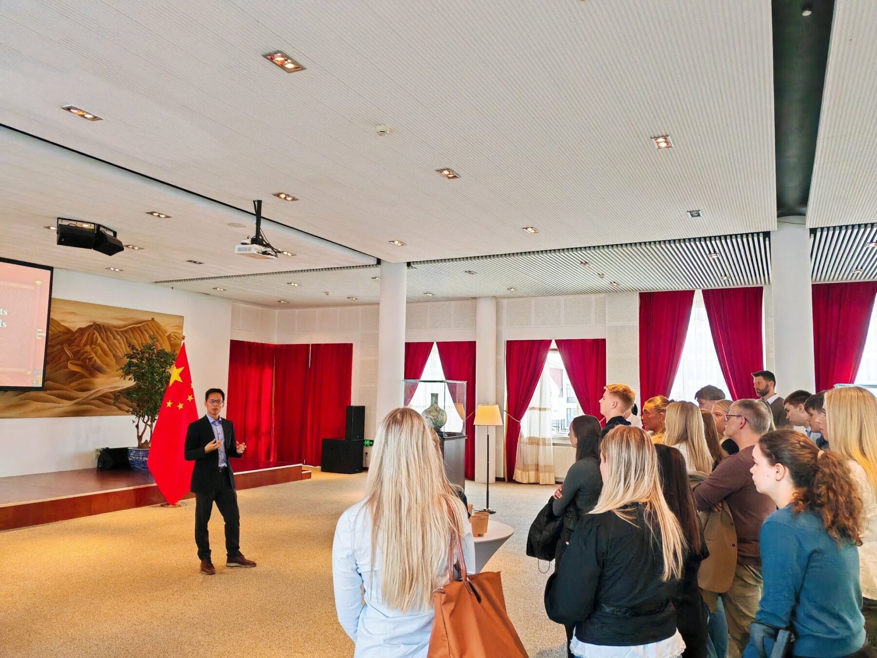 02.05.2025 Nemendur heimsækja kínverska sendiráðið Síðastliðinn miðvikudag heimsóttu nemendur á þriðja ári á alþjóðabraut kínverska sendiráðið í Borgartúni. Þar tók á móti hópnum kínverski sendiherrann, He Rulong, og fleiri úr starfsliði sendiráðsins. Hópurinn fékk kynningu á starfsemi sendiráðsins og átti síðan um klukkutíma innihaldsríkt spjall þar farið var yfir víðan völl og m.a. rætt um samskipti landanna og stöðu Kína í alþjóðasamfélaginu. Einnig var gaman heyra frá starfsmönnum sendiráðsins hvernig það er að vera sendifulltrúi á Íslandi. Nemendur hafa á þessari önn verið að kynna sér málefni Suðaustur Asíu og var fróðlegt að heyra um viðhorf Kínverja frá fyrstu hendi. Einstaklega vel var tekið á móti hópnum og létu nemendur og kennarar mjög vel af heimsókninni.