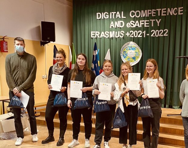 29.11.2021 Nemendur heimsóttu Grojec í Póllandi Fjórir nemendur á 2. ári á alþjóðabraut fóru ásamt tveimur kennurum til bæjarins Grojec í Póllandi í síðustu viku. Var ferðin farin á vegum Erasmus+ nemendaskiptaáætlunarinnar sem er í boði Evrópusambandsins. Verzló hefur verið ötull þátttakandi í Erasmus+ verkefnum undanfarin ár og er þetta einungis eitt af mörgum sem eru í gangi í skólanum þessa dagana. Yfirskrift þessa verkefnis er Digital Competence and eSafety og er markmiðið að stuðla að bættri þekkingu nemenda á internetinu og sérstaklega þeim hættum sem notkun þess fylgja. Í samstarfinu eru sex skólar frá jafn mörgum löndum í Evrópu. Íslensku nemendurnir gistu hjá pólskum fjölskyldum alla vikuna en næsta vor munu þeir svo taka á móti erlendu gestunum þegar þeir koma hingað til lands. Ferðin gekk með eindæmum vel og náðu fjölþjóðlegu nemendahóparnir afar vel saman. Fulltrúar skólans, þær Halldóra, Hildur, Nína og Þóra, stóðu sig svo sannarlega með prýði!