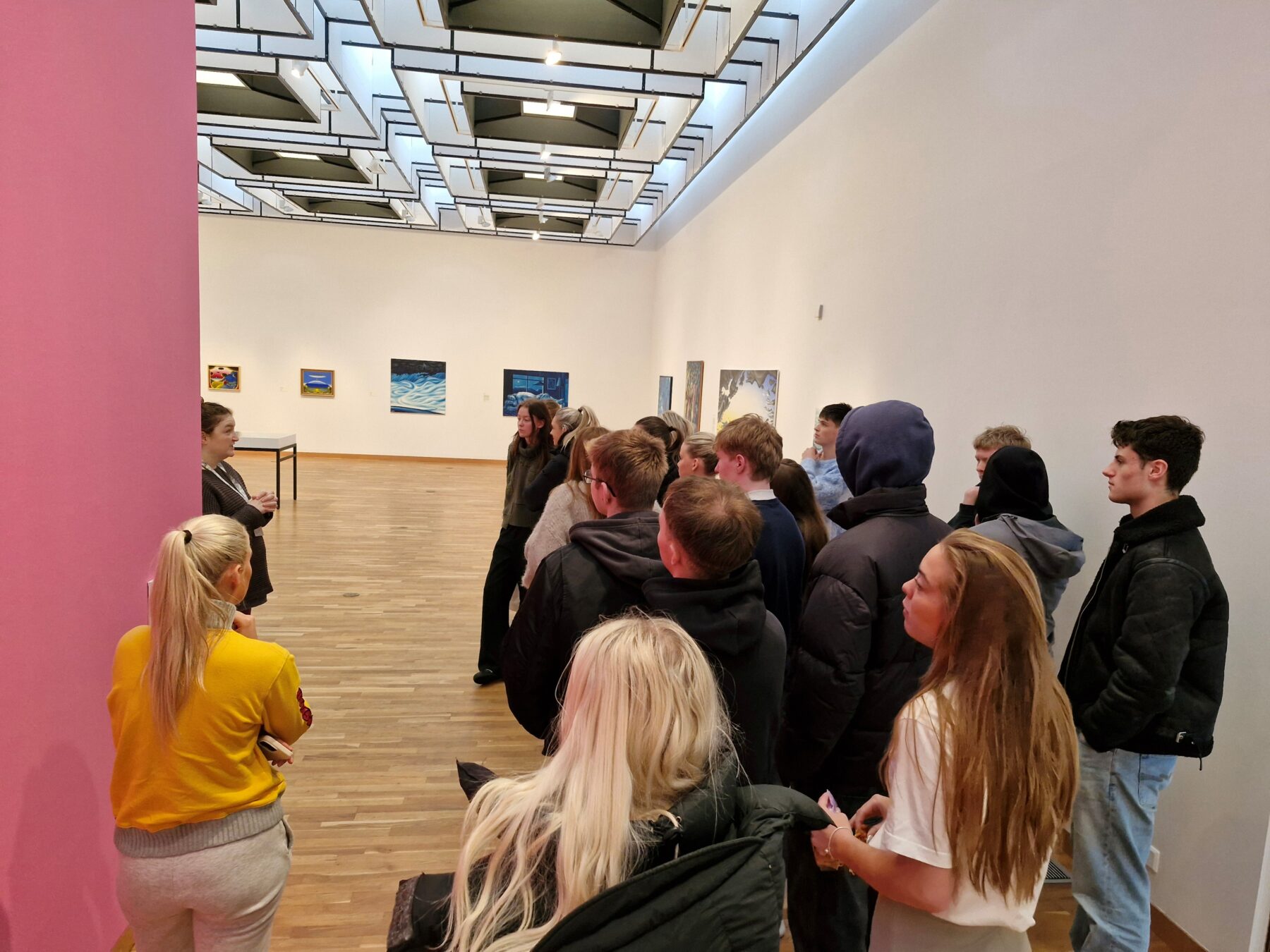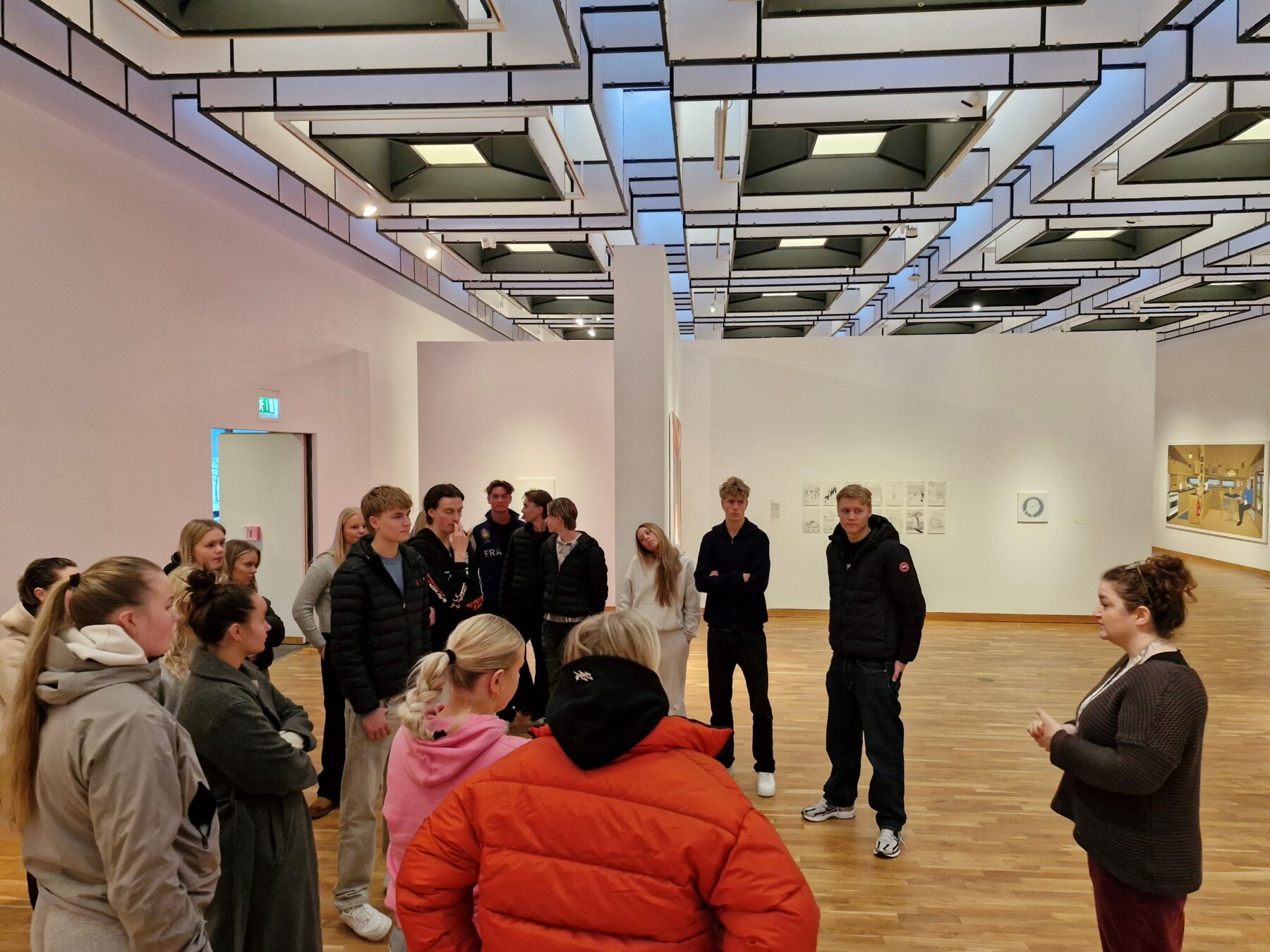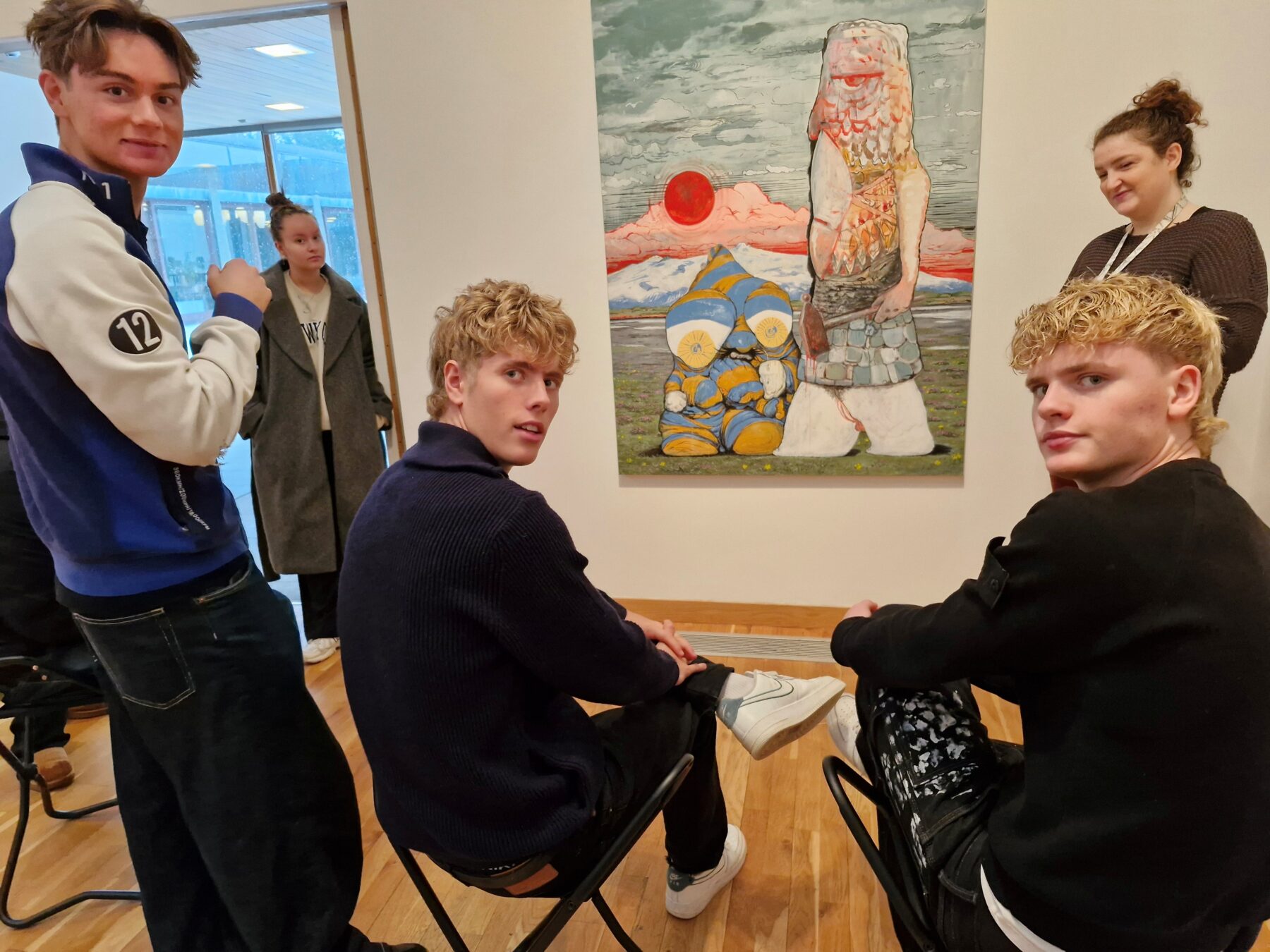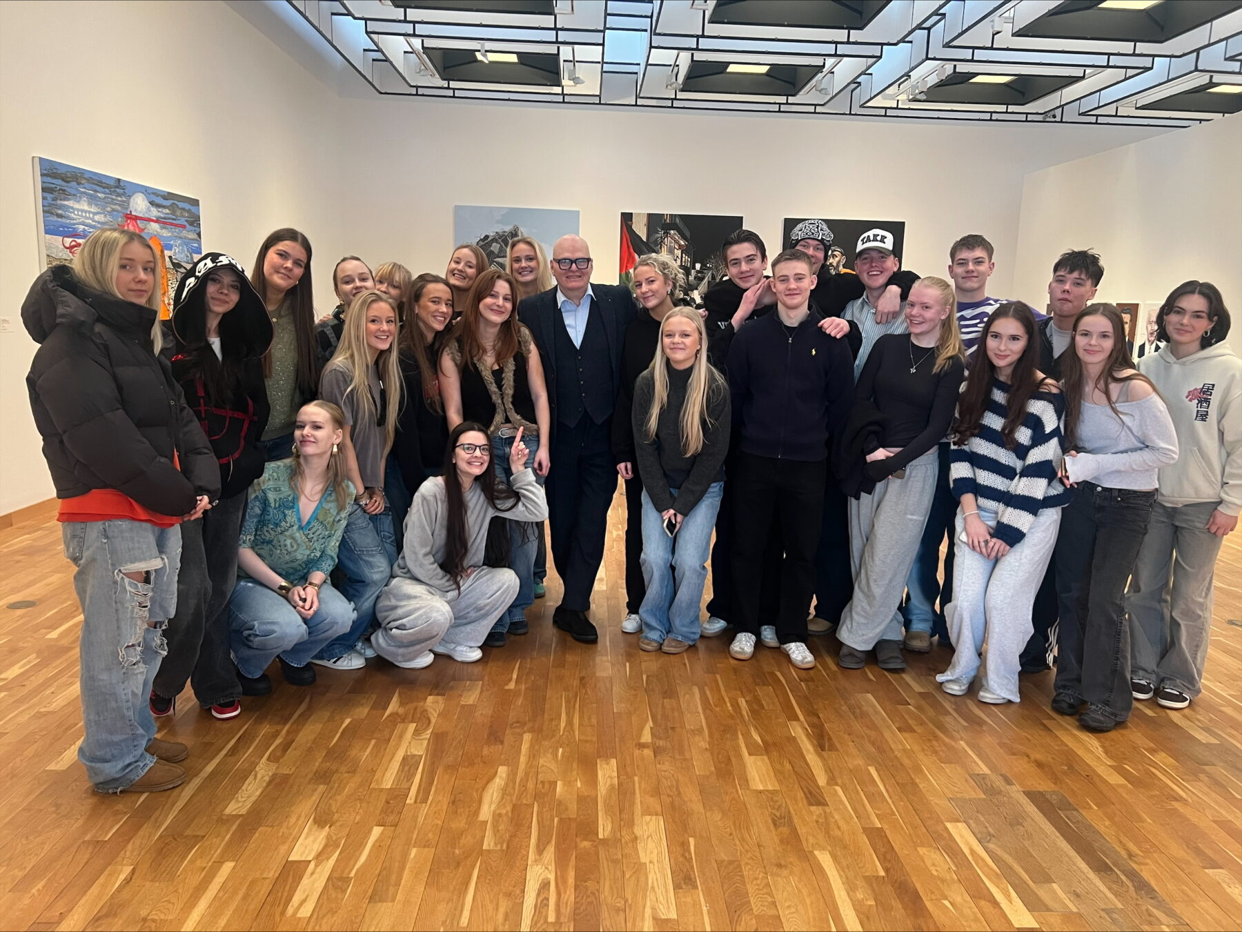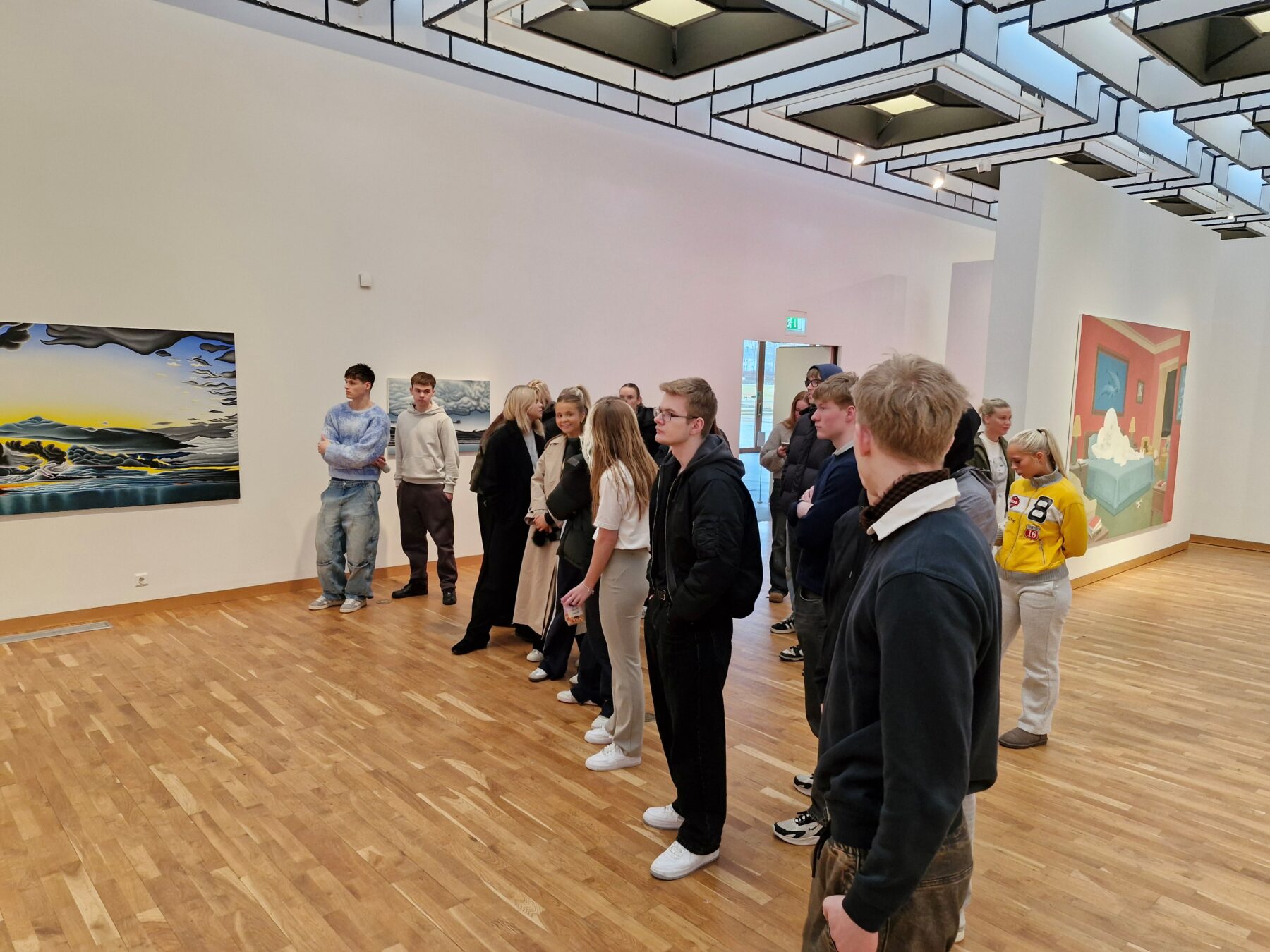 07.02.2025 Nemendur njóta myndlistar Hallgríms Helgasonar Nemendur Verzlunarskólans heimsóttu Kjarvalsstaði í vikunni til að njóta málverkasýningar Hallgríms Helgasonar sem ber heitið Usli. Á sýningunni er „sjónum beint að höfundarverki Hallgríms. Í verkum sínum segir Hallgrímur sögur sem hafa persónulega skírskotun um leið og þær endurspegla tíðaranda eða eru viðbragð við atburðum veraldarsögunnar“, eins og segir í sýningarskrá. Heimsóknin tengist annars vegar lestri 3. bekkinga á skáldævisögu Hallgríms, Sjóveikur í München, þar sem hann segir frá einum vetri í lífi sínu er hann stundaði myndlistarnám í borginni á árunum 1980-1981, en hins vegar námi 2. bekkjar í Menningu og listum. Í verkum sínum leitast Hallgrímur jafnan við að ögra ríkjandi hefðum og viðhorfum hvort sem um er að ræða ljóðlist, sagnalist eða myndlist. Verkin á sýningunni vöktu upp ýmsar spurningar og vangaveltur meðal nemenda um ástand heimsmála, stríðsrekstur, stöðu og eðli feðraveldisins auk pælinga um stöðu og hlutverk listamanna í nútímaþjóðfélagi. Nemendur á öðru ári Nýsköpunar- og listabrautar hittu Hallgrím á sýningunni og höfðu mjög gaman af Skeggrætt um stöðu feðraveldisins Nemendur 3-I við hið sögufræga málverk Guð á Sæbrautinni eftir Hallgrím Helgason