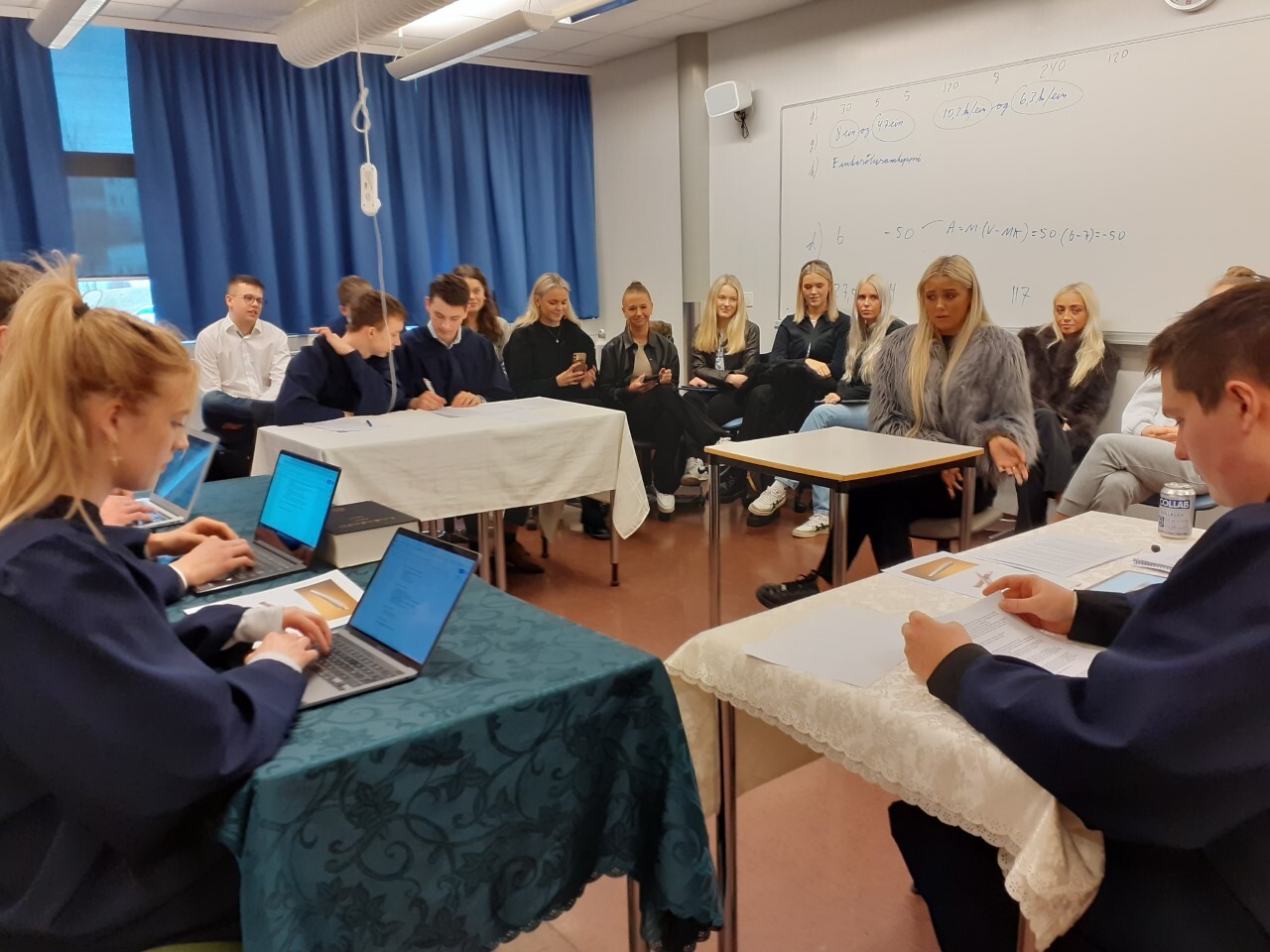 27.03.2022 Nemendur settu á svið réttarhöld Nemendur í lögfræði settu á svið réttarhöld í þessari viku og síðustu. Þeim hafði áður verið raðað í þrjá hópa; stefnanda, stefnda og dómara. Stefnendur útbjuggu stefnu, stefndu settu saman greinargerð og síðan fór fram aðalmeðferð með skýrslutökum og munnlegum flutningi máls sem dómarar stýrðu. Um var að ræða tilbúið meiðyrðamál sem varðaði tiltekin ummæli sem birst höfðu í Viljanum. Dóms er að vænta á næstu dögum.