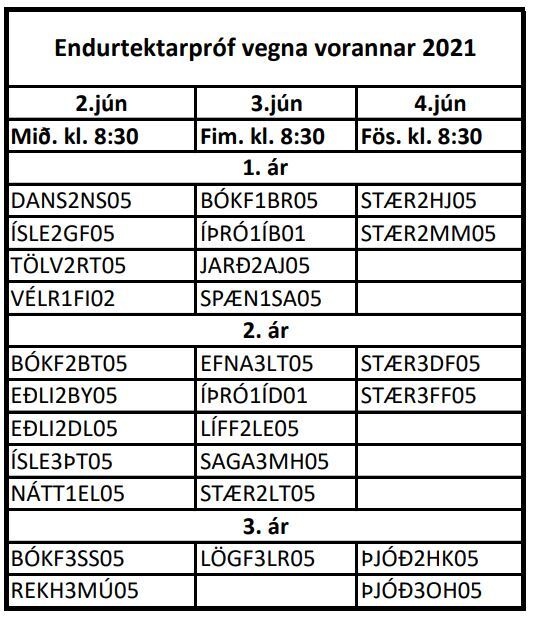 25.05.2021 Próftafla endurtektarpófa Dagana 2. – 4. júní verða endurtektarpróf í dagskólanum. Próftöfluna og upplýsingar um greiðslu fyrir hvert próf er að finna hér . Nemendur sem ekki ná endurtektarprófi, eða kjósa að þreyta þau ekki, þurfa að endurtaka áfangann í fjarnámi Verzlunarskólans. Mikilvægt er að þeir nemendur, sem ekki ná endurtektarprófi, skrái sig sjálfir í fjarnámið á heimasíðu skólans um leið og niðurstöður liggja fyrir. Nemendur VÍ geta skráð sig til 8. júní.