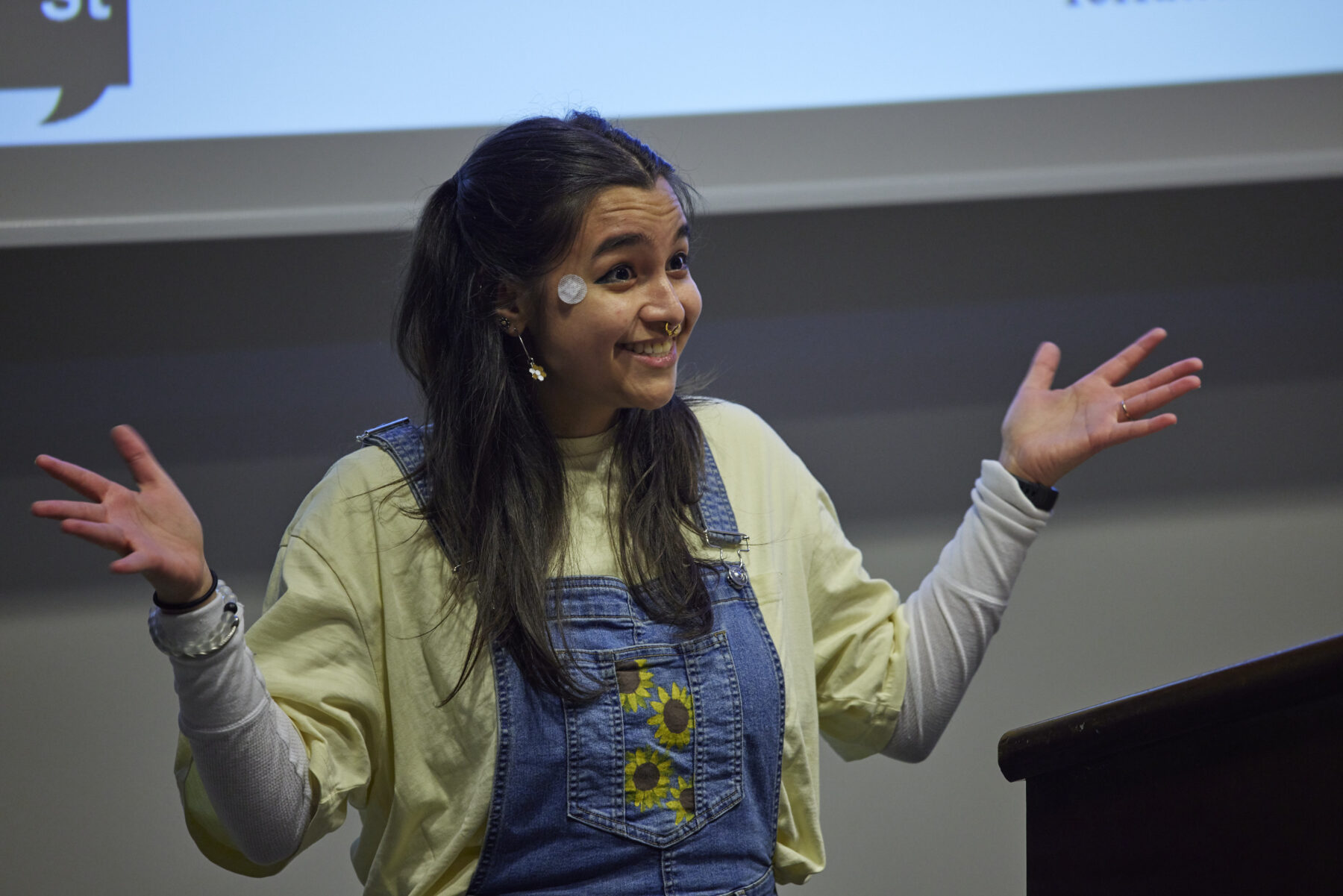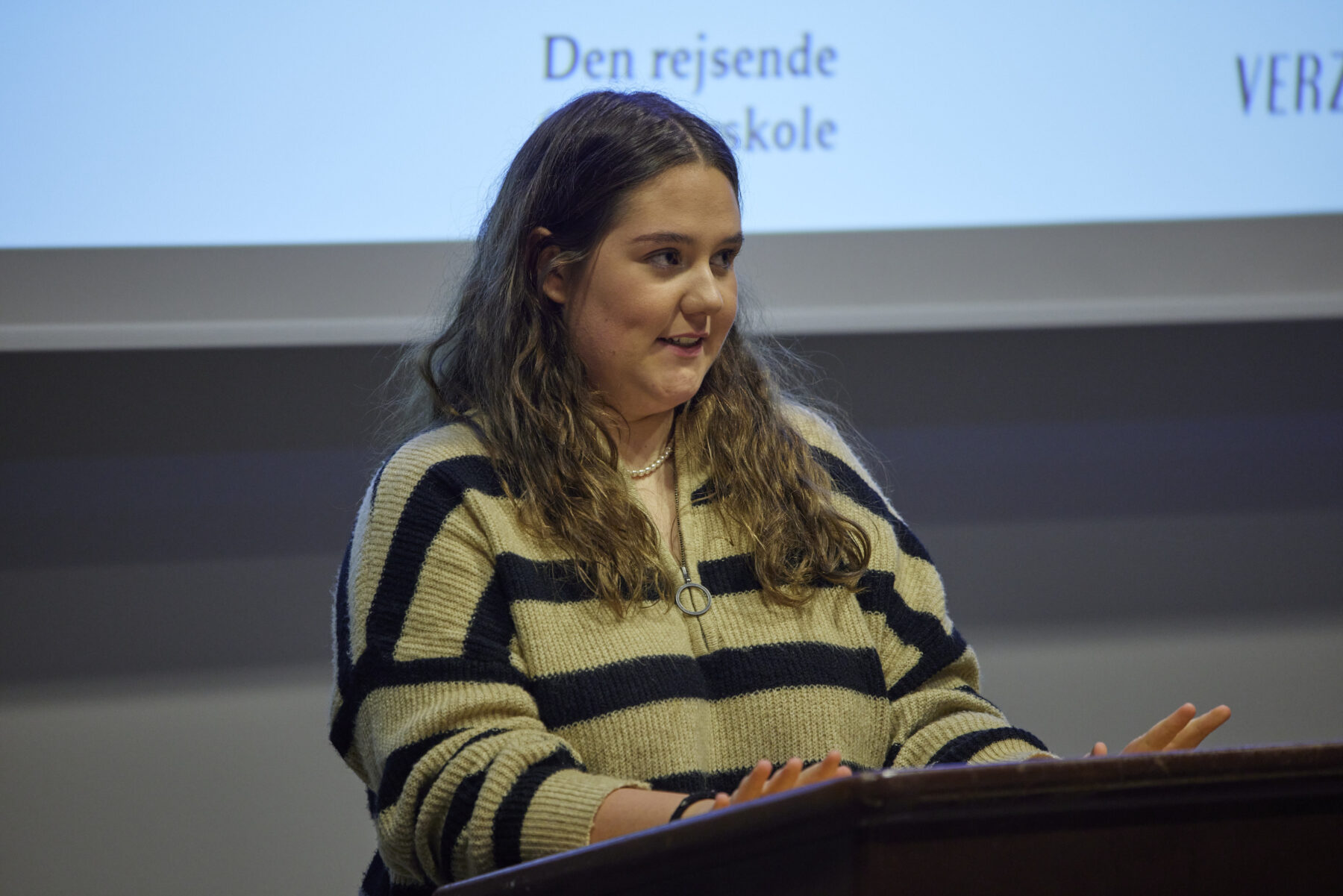 16.10.2023 Ræðunámskeið Kostir og gallar gervigreindar, kynjastaðalmyndir, skortur á jafnrétti, ógnin gegn íslenska laxinum, áskoranir í heilbrigðiskerfinu og þörfin fyrir fjármálafræðslu voru nokkur af þeim viðfangsefnum sem níu nemendur úr fjórum framhaldsskólum fjölluðu um fyrir fullum sal áhorfenda í Versló fimmtudaginn 12. október. Nemendurnir voru þátttakendur í verkefninu Nordröst, talerskolen í Nordatlanten – Raddir norðursins – ræðuskóli Norðuratlandshafsins. Nemendurnir komu frá Borgarholtsskóla, Kvennaskólanum, Fjölbrautaskóla Mosfellsbæjar og Verzlunarskóla Íslands. Kennarar á námskeiðinu voru Pia Beltoft og Martin Fehr Thekildsen frá Røst stofnuninni, þau eru frá Danmörku og bæði kennarar í ræðumennsku með mikla reynslu. Undanfarin ár hafa þau unnið með Anette Molbech frá Höfundaskóla á ferðinni (Den Rejsende Forfatterskole) um að þróa Nordrøst, ræðuskóla Norðuratlanshafsins, en Anette stýrði námskeiðinu hér í Versló. Tengiliður og samstarfsaðili hennar í Versló var Ármann Halldórsson, umsjónarmaður alþjóðaverkefna. Fjöllistakonan Steiney Skúladóttir, meðal annars þekkt fyrir að rappa með Reykjavíkurdætrum og margskonar grínstarfsemi stýrði viðburðinum og kynnti ræðurnar, auk þess sem hún hitti hópinn og kynnti þeim fyrir fjölbreyttum aðferðum til að tjá hugsanir sínar og tilfinningar. Þátttakendur voru hæst ánægðir og aldrei að vita á hvaða stærri sviðum við eigum eftir að sjá þau í framtíðinni!