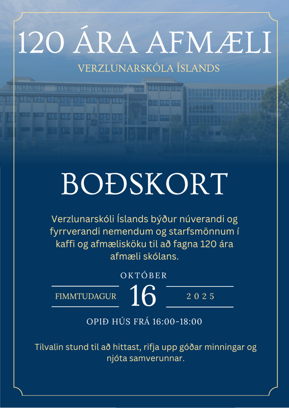 09.10.2025 Verzlunarskóli Íslands fagnar 120 ára afmæli Verzlunarskóli Íslands fagnar 120 ára afmæli fimmtudaginn 16. október 2025. Af því tilefni býður skólinn núverandi og fyrrverandi nemendum og starfsfólki í kaffi og afmælisköku í skólanum frá kl. 16:00–18:00. Þetta er tilvalin stund til að hittast, rifja upp góðar minningar og njóta samverunnar .