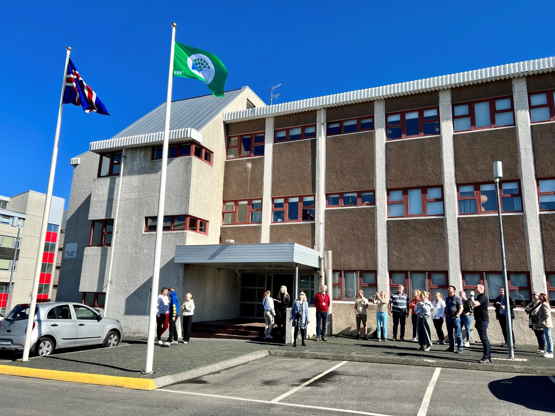 02.06.2022 Verzlunarskóli Íslands hlýtur Grænfánann í þriðja sinn Föstudaginn 13. maí tók Verzlunarskólinn á móti Grænfánanum í þriðja sinn. Grænfáninn er alþjóðleg viðurkenning á góðum árangri í umhverfismálum. Fulltrúar í umhverfisnefnd nemenda og Margrét Auðunsdóttir, verkefnastjóri Grænfánaverkefnisins veittu fánanum viðtöku úr hendi verkefnisstjóra Landverndar. Að því loknu var fáninn dreginn að húni í glampandi vorsólinni sem ríkti þennan fallega dag. Umhverfisnefndin var mjög fjölmenn þetta árið, alls voru í henni 53 einstaklingar. Nemendur í umhverfisnefndinni unnu mjög gott starf á árinu, t.a.m. stóðu þeir að umhverfisdegi VÍ þann 8. mars sem helgaður var sjálfbærni og loftslagsbreytingum. Á deginum fór fram kökusala með heimabökuðum kökum til kolefnisjöfnunar en ágóði sölunnar var notaður til að planta trjám í samstarfi við kolefnissjóðinn Kolvið. Jafnframt var haldinn fataskiptimarkaður, þar sem nemendur og starfsmenn skólans komu með fatnað sem ekki nýttist þeim lengur. Allir gátu svo tekið sér þann fatnað sem þeim hentaði án þess að því fylgdi neinn kostnaður. Einnig nýttu nemendur í hönnun sér fatnaðinn til að endurskapa og nota á sýningu sem nemendur á listabraut skólans héldu í kjölfarið. Það sem eftir var af fötunum var farið með í Rauða Krossinn til að binda endahnút að aðgerðir gegn fatasóun sem þetta verkefni gekk út á. Nemendur í umhverfisnefnd skólans árið 2022 hafa unnið mjög gott starf, en í fyrsta sinn var efnt til fjöldahreyfingar í umhverfisnefnd. Þetta var gert í þeim tilgangi að auðveldara væri að breiða út boðskapinn og skapa menningu með umhverfisvænum lífsstíl sem endurspeglast í starfsemi skólans eins og Umhverfisstefna Verzlunarskóla Íslands miðar að.